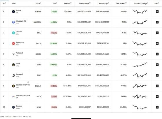 카르다노는 374억 달러로 전체 공급량의 70.5%가 스테이킹됐고 수익률은 5.71%다.