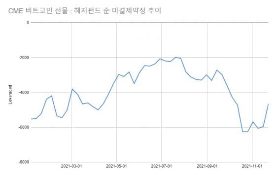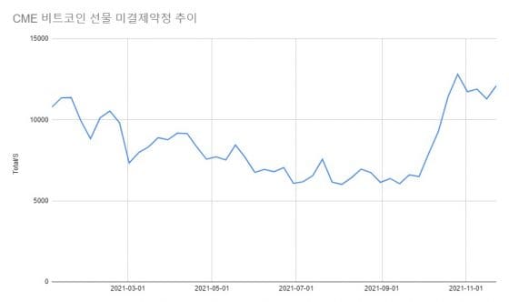 미국 상품선물거래위원회(CFTC)가 발표한 11월 23일자 미결제약정 데이터를 보면 시카고상품거래소(CME)의 비트코인 선물 총 미결제약정은 직전주 대비 818 계약 늘어난 1만2110 계약이었다.
