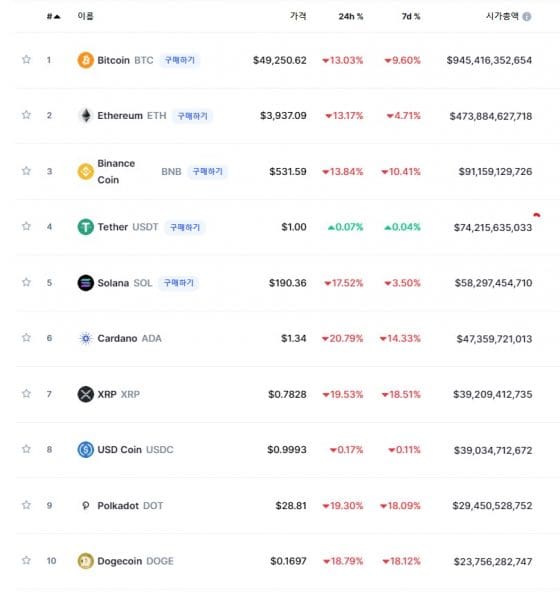 코인마켓캡 기준으로 한국 시간 오후 2시 현재 비트코인은 24시간 전보다 13.3% 하락한 4만9250달러에 거래되고 있다. 5만달러선이 붕괴됐고 시가총액 1조달러도 무너진 9조4541억달러로 내려않았다.