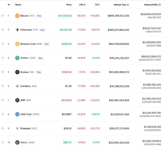 코인마켓캡에 따르면, 비트코인 가격은 뉴욕시간 오후 4시 기준 4만7529.03달러로 24시간 전 대비 6.57% 하락했다.