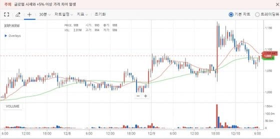 업비트에서도 리플은 폭등한 뒤 조정을 보이고 있다. 비트코인을 포함한 대부분의 코인이 하락한 가운데 리플은 전일보다 상승했다.