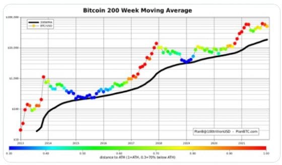 그러면서 플랜B는 비트코인은 200주 이동평균 이하로 떨어진 적이 없으며, “절대 그런 일이 없을 것”이라고 강조했다.