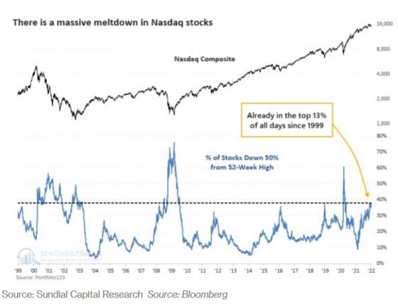 선다이알 캐피탈 리서치에 따르면 나스닥 종목 10개 중 4개는 52주 최고가 대비 50% 이상 가격이 떨어졌다.