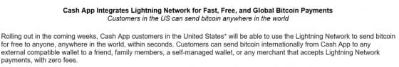 캐시 앱은 “라이트닝 네트워크를 채택해 수초안에 전세계 어디에 누구에게라도 비트코인을 공짜로 보낼 수 있게 됐다”고 밝혔다