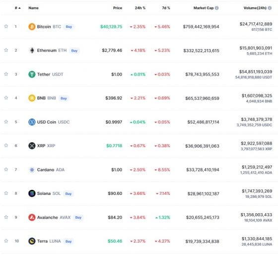 18일(현지시각) 암호화폐 시장은 비트코인이 4만달러를 오르내리는 가운데 오전에 비해 전반적으로 낙폭을 줄이며 마감했다. 톱10 종목 중 8개가 하락했고, 톱100 중 84개의 가격이 내렸다.