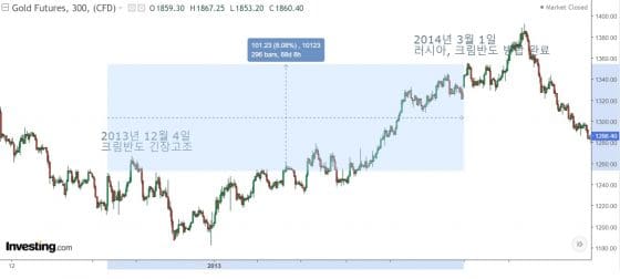 2014년 크림반도 위기가 고조되기 시작하면서 금 가격은 상승 흐름을 타서, 러시아에 병합이 완료되자 고점을 형성했다. 당시 금 가격 상승 폭은 8% 수준이었다.