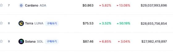 [블록미디어]테라의 네이티브 토큰 루나(LUNA)의 시가총액이 솔라나(SOL)를 추월했다.