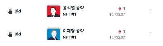 오픈씨에 등재된 YTN 공약 NFT 중 이재명 1호와 윤석열 1호에 대해 1이더리움에 사자 주문이 들어왔습니다. 해당 NFT는 선거 당일인 9일 오후 6시까지 경매 방식으로 수집가들에게 인도될 예정입니다.