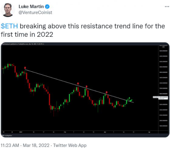 기술 분석가 루크 마틴은 지난 18일 이더리움이 2022년 들어 처음으로 저항 추세선을 상향 돌파했다고 트위터를 통해 밝혔다.