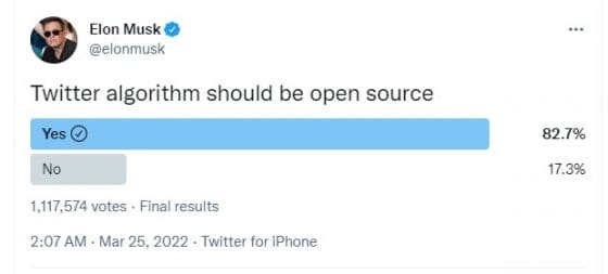 일론 머스크는 이에 앞서 “트위터의 알고리즘이 오픈 소스여야 한다고 생각하느냐”는 조사를 실시했다.
