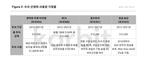 수치 산정에 사용된 투자자 가정은 ‘완벽한 마켓 타이밍(투자자 A), 달러비용평균법(투자자 B), 동반투자(투자자C), 현금 보유(투자자D)’의 4건이다. 각 가정에 따른 투자는 2012년부터 2021년까지 진행되었다.