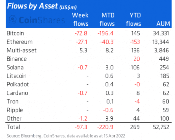 19일(현지시간) 공개된 코인셰어스 주간 보고서에 따르면 4월 15일 기준으로 이전 한주 동안 전체 암호화폐펀드에서 총 9730만달러의 자금 순유출이 발생했다. 순유출은 디지털 자산 펀드에 새로 유입된 자금보다 빠져나간 기존 자금이 많다는 것을 의미한다.