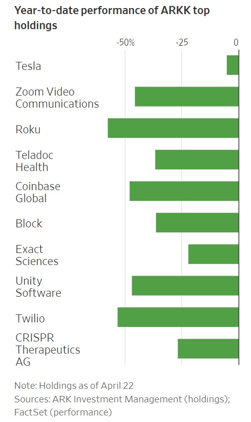 ARKK는 테슬라, 줌, 로쿠, 텔라독 헬스, 코인베이스 등 월가의 대표적인 혁신 기술주를 보유 중이다. 테슬라를 제외하고 대부분 35% 넘게 떨어졌다.
