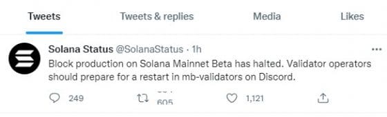 솔라나 트윗계정은 1일 오전 6시(한국시간) “솔라나 메인넷 베타의 블록형성이 중단됐다”고 밝혔다.
