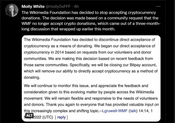 앞서 위키피디아측은 지난 1월부터 석달간 암호화폐 기부 중단에 대한 투표를 진행했고 커뮤니티는 찬성 234, 반대 94로 암호화폐 기부 중단 요구를 결정했다.