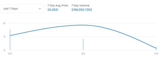 평균 가격도 하향 곡선을 그리고 있다. 10 이더리움까지 올라갔던 평균 가격은 8 이더리움 수준으로 20% 떨어졌다.