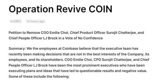 해당 글은 코인베이스의 주요 임원(C레벨) 세 명의 이름을 열거하며 이들이 회사에 도움이 되지 않는 행동을 했다며 사임을 요구했다. 일종의 연판장을 돌린 것.