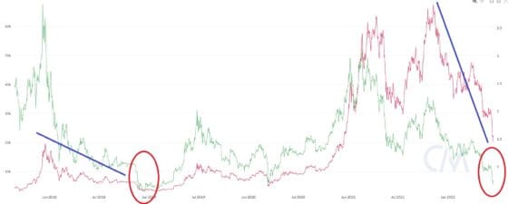 비트코인 온체인 지표 중 프리 플로팅(free floating) 기준 MVRV를 보면 2017년 고점 갱신 후 저점을 바닥을 기록했던 2018년 12월 겨울 수준에 거의 급접한 상황이다.(아래 그림)