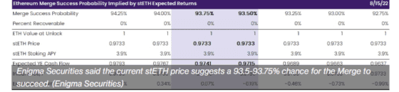 현재 1 stETH가 0.973 ETH에 거래되는 것은 머지 업그레이드가 정해진 일정에 따라 순탄하게 진행될 가능성이 93.5% ~ 93.75%임을 암시하는 것이라고 이니그마는 추산한다.