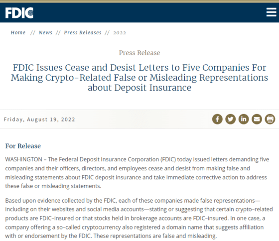 FDIC는 이날 보도자료에서 FTX US, Cryptonews.com, FDICCrypto.com, SmartAsset.com, Cryptosec.info에 이같은 내용의 편지를 발송했다고 밝혔다.
