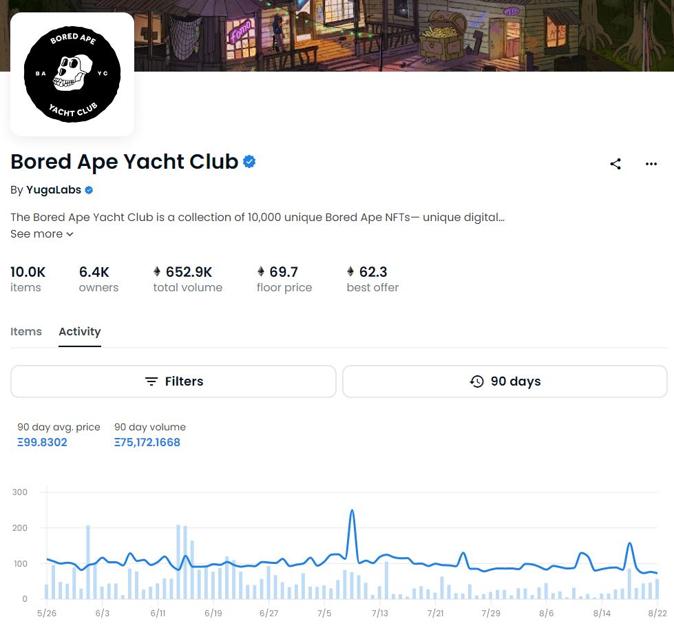 [블록미디어 최동녘 기자] 지루한 원숭이 요트 클럽(BAYC) 이더리움(ETH) 바닥가가 올해 최저 수준으로 하락했다. 한국 시간 8월 22일 오전 11시 30분, 현재 BAYC 바닥가는 69.7 ETH이다.