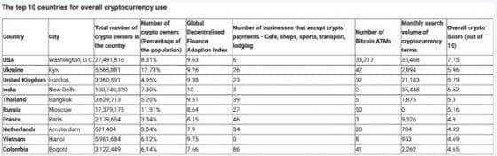 이 조사에서는 50개 국가를 대상으로 국가별 암호화폐 이용자 수, 탈중앙화 금융(디파이) 채택 지수, 암호화폐 결제 가능 기업 수, 비트코인 ATM 수, 암호화폐 관련 검색량 등을 점수로 평가했다.