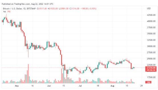 코인마켓캡 자료에서 비트코인은 뉴욕시간 오후 0.2% 하락한 2만1362달러, 이더리움은 2.3% 내린 1580달러에 거래됐다.
