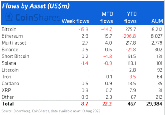 전체 디지털자산펀드는 지난주 870만달러 자금 유출을 기록했다. 지난주 전체 디지털펀드의 자금 이동 규모는 10억달러로 연평균 수치와 비교할 때 55% 적은 것으로 밝혀졌다. 이는 여름철 투자자들의 암호화폐 시장 참여가 저조하다는 것을 시사한다.