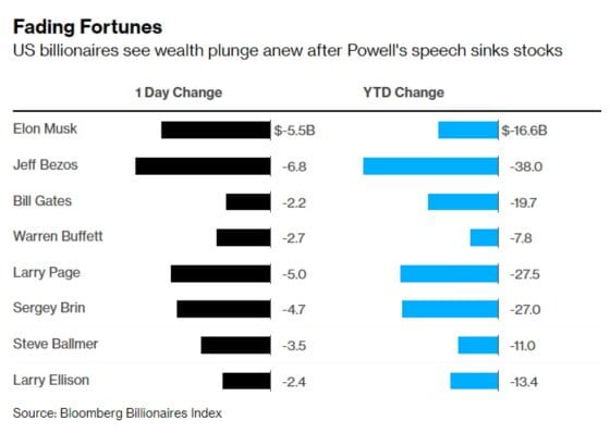 [블록미디어] 제롬 파월 연준 의장의 잭슨 홀 연설로 미국 주식시장이 급락했는데요. 8분 짜리 연설로 미국 최대 부자들의 재산 780억 달러(104조 원)가 사라졌다고 27일 블룸버그 통신이 보도했습니다.