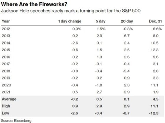 그러나 역사적으로 볼 때 잭슨 홀 미팅은 주식시장에 별다른 영향을 미치지 않는 이벤트였습니다. 2012년 이후 잭슨 홀 미팅 당일 주가 움직임을 평균해서 보면 0.2% 떨어졌고, 연말까지 등락을 계산해보면 플러스 4.5% 정도였습니다.