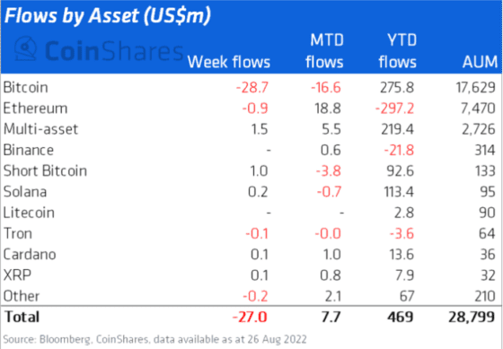 29일(현지시간) 공개된 코인셰어스 주간 보고서에 따르면 8월 26일 기준으로 이전 한 주 동안 전체 디지털자산에서 총 2700만달러가 빠져나갔다.