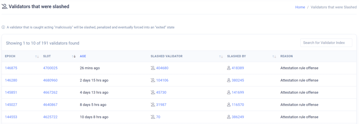 이더리움은 네트워크 안정성 확보를 위해 비정상 밸리데이터에게 페널티와 슬래싱을 부여한다. 검증 노드가 정상 작동하지 않으면 페널티가 부여되며, 장시간 블록 갱신을 하지 않거나 이중 서명을 진행할 경우 슬래싱 처벌(지분 삭감, 밸리데이터 퇴출)을 받게 된다.