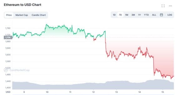 16일(현지시간) 코인마켓캡 자료에서 뉴욕장 출발 전 이더리움은 7.6% 하락한 1468달러를 기록했다.