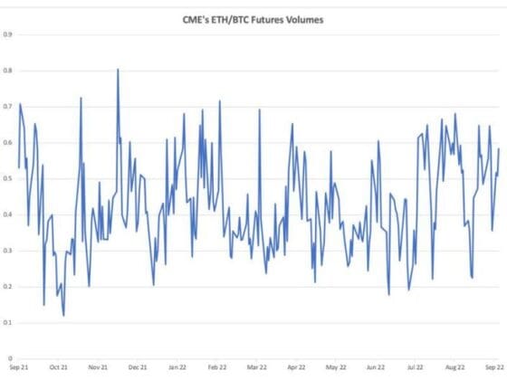 기관 투자자들이 주로 이용하는 시카고상품거래소(CME)의 이더리움 선물 거래량은 아직도 비트코인보다 적다.