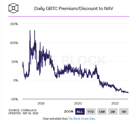 [뉴욕 = 장도선 특파원] 비트코인 현물 대비 GBTC(그레이스케일 비트코인 트러스트) 가격 할인폭이 사상 최고를 기록했다.
