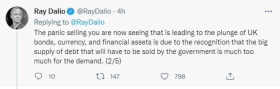 레이달리오는 투자자와 정책입안자들에게 “영국의 재정실수에 교훈에서 배워야 한다”고 트위했다.