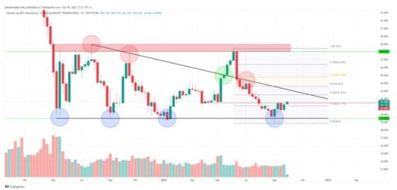 BTCD는 2021년 5월 이후 39.50%~48%대에서 움직이고 있는데, 최근 주간 차트를 보면 이미 39.5% 수준이 4차례 지지 수준으로 확정됐음을 알 수 있다.