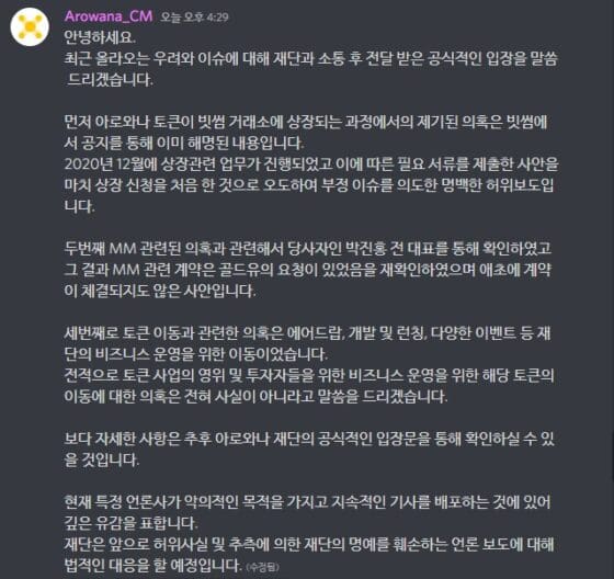 아로와나는 “빗썸 거래소 상장 의혹과 마켓 메이킹 의혹도 사실이 아니다”고 말했다. 아로와나는 블록미디어의 기사를 지칭하며 “악의적인 목적으로 기사를 배포하고 있다”고 비난했다.
