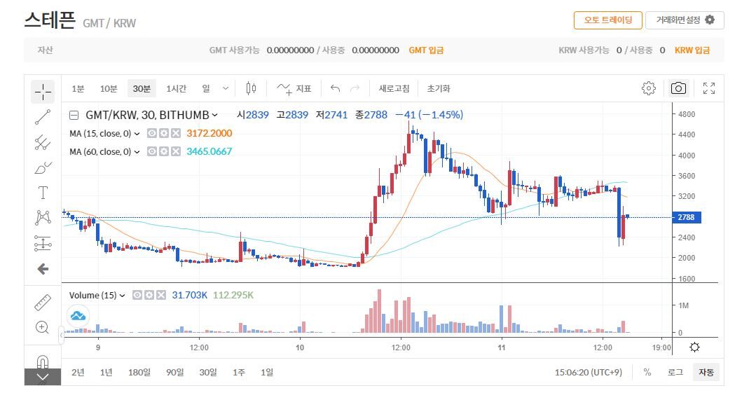 11일 오후 3시, 빗썸의 스테픈(GMT) 거래가는 2788원이다. 같은 시간 바이낸스 GMT 거래가는 0.6256달러(원화 약 898원)였다. 빗썸의 김치 프리미엄은 210.6%에 달했다. 빗썸 이용자는 글로벌 거래소 대비 동일한 토큰을 3배 넘게 비싼 가격에 구매해야 하는 것이다.
