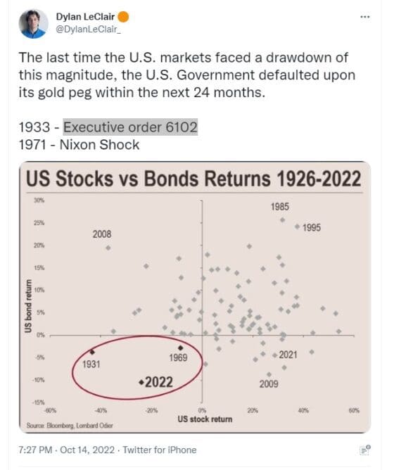 딜런 르클레어는 주식과 채권시장이 모두 마이너스 수익율을 기록한 뒤 24개월 이내에 미국 정부는 달러와 금을 교환해 주는 것을 중단하는 디폴트를 겪었다고 말했다.