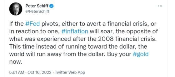 피터 쉬프는 정부가 법률에 근거해 발행하는 피아트머니는 진짜 돈이 아니고 인플레이션으로 가치가 지속적으로 하락한다며 가치저장 수단인 금을 사라고 주장하고 있다.
