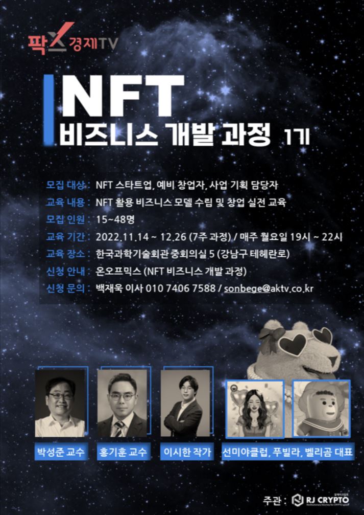 이번 NFT 비즈니스 개발 과정에는 알제이크립토(주)(대표이사 서범석)가 함께 한다. 알제이크립토(주)는 팍스경제TV의 NFT 교육 과정 기획·운영 파트너로 최근 고려대 스타트업 연구원(원장 신호정 교수)과 업무 협약을 체결하는 등 NFT 스타트업 양성을 위해 활발한 움직임을 보이고 있다.