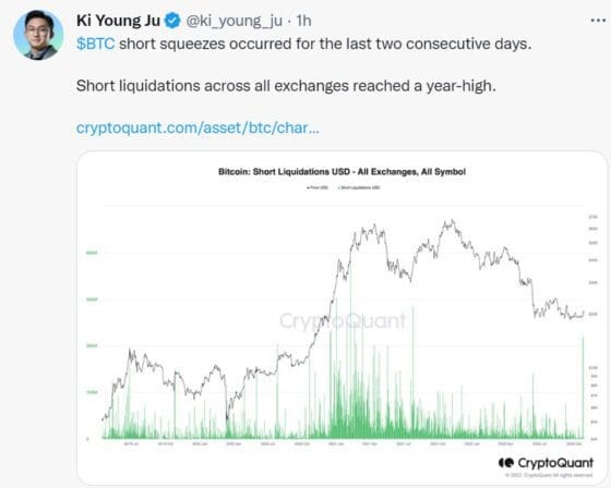 [블록미디어]크립토 퀀트 주기영 대표가 28일 “비트코인 숏 (short squeeze)가 지난 이틀간 연속해서 발행했다”고 트윗했다.