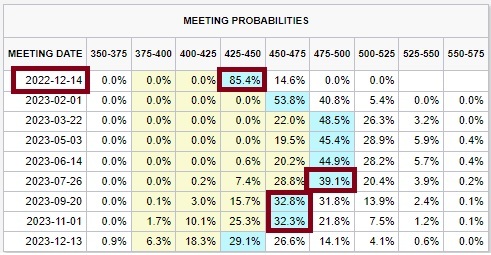 앞서 9월 연준은 FOMC에서 점도표를 통해 내년 기준금리 4.6%를 전망했지만, 11월 FOMC 후 기자회견에서 파월 의장은 “최종금리가 (기존 예상보다) 더 높아질 수도 있다”고 말해 최종금리가 5%에 육박할 가능성도 시사했다.