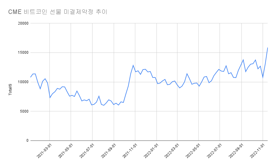 [블록미디어 최동녘 기자] 기관 투자자들의 비트코인 선물 미결제 약정 수가 증가했다. 미국 상품선물거래위원회(CFTC)가 발표한 시카고상품거래소(CME) 비트코인 선물 미결제 약정은 11월 8일 1만 3081건에서 11월 15일 1만 5873건으로 2792건 늘었다.