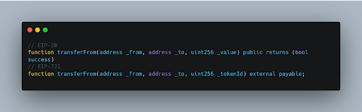 EIP-721, EIP-1155는 우리에게 친숙한 NFT를 다루는 표준입니다. NFT를 나타내는 만큼 각 토큰은 더 이상 분리가 불가능합니다. EIP-20과의 차이는 토큰의 전송을 나타내는 transferFrom 함수를 보면 쉽게 비교할 수 있습니다.