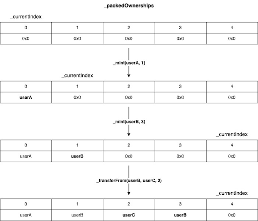 - _mint(userB, 3) 을 실행해서 userB가 3개를 민팅합니다. _packedOwnerships 에는 첫번째 토큰, 즉 1번에만 userB의 주소를 기록해둡니다.