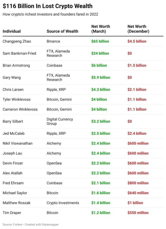 FTX 공동창업자인 샘 뱅크먼-프리드(SBF)와 개리 왕은 억만장자 지위를 잃었다. 이들의 자산은 3월 각각 240억 달러와 59억 달러였으나 12월 거의 대부분 사라졌다. 디지털커런시그룹(DCG) 설립자 베리 실버트(Barry Silbert)의 자산 가운데 32억 달러도 FTX 붕괴로 사라졌다.