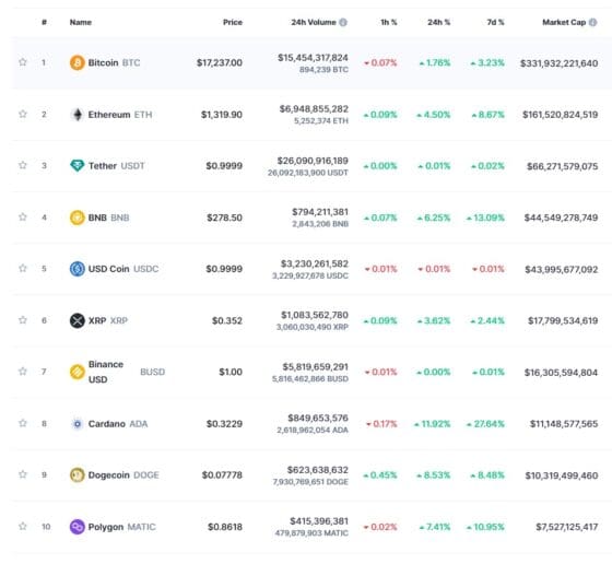 이더리움 4.50%, BNB 6.25%, XRP 3.62%, 카르다노 11.92%, 도지코인 8.53%, 폴리곤 7.41% 가격이 올랐다.