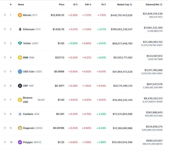 코인마켓캡에 따르면, 비트코인 가격은 뉴욕시간 오전 9시 기준 2만2859.32달러로 24시간 전 대비 1.53% 하락했다.